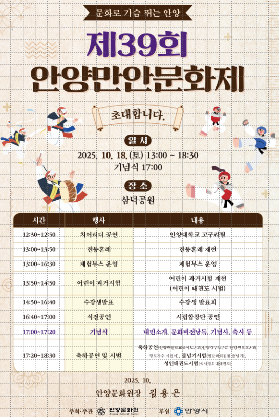 1986년 시작된 지역문화 축제…전통혼례·과거시험 재현 등 전통혼례 및 어린이 과거시험 재현 등 볼거리가 가득한 제39회 안양만안문화제가 오는 18일 낮 12시 30분 안양시 만안구 삼덕공원에서 열린다. 17일 안양시에 따르면, 안양문화원이 주관하는 안양만안문화제는...