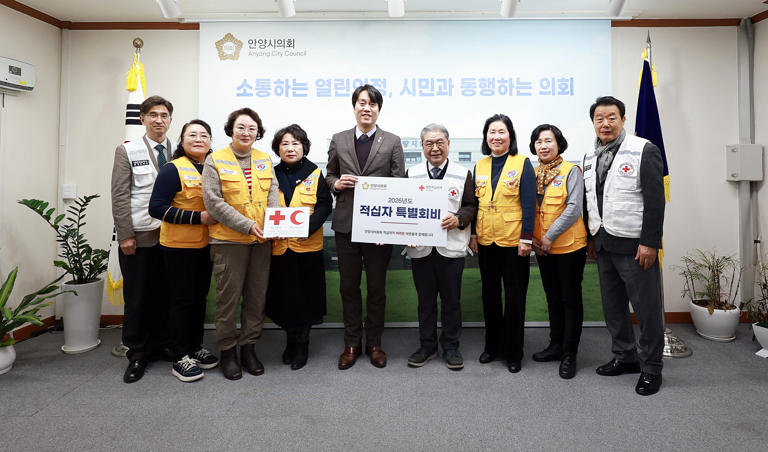 안양시의회(의장 박준모)는 12월 30일(화) 안양시의회 의장실에서 2026년 적십자 특별회비를 대한적십자사 경기도지사에 전달했다. 이날 전달식은 박준모 의장을 비롯해 이재정 대한적십자사 경기도지사 회장 등 적십자사 관계자 10명이 참석한 가운데 진행됐다. 박준모 의장은 “소외계층...