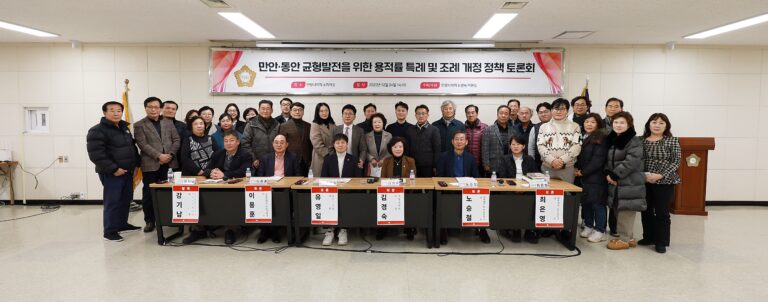 안양시의회 김경숙 의원(국민의힘, 석수1·2동·충훈동)은 12월 24일 시의회 소회의실에서 「만안·동안 균형발전을 위한 용적률 특례 및 조례 개정 정책토론회」를 개최하고, 만안과 동안 간 개발 격차 해소를 위한 다양한 정책 대안을 논의했다.
